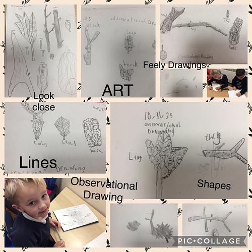 The children worked really hard looking closely at the objects they found in nature and practising ‘feely drawing’; handling the items, thinking about the textures we could feel and replicating them with different pencil techniques.