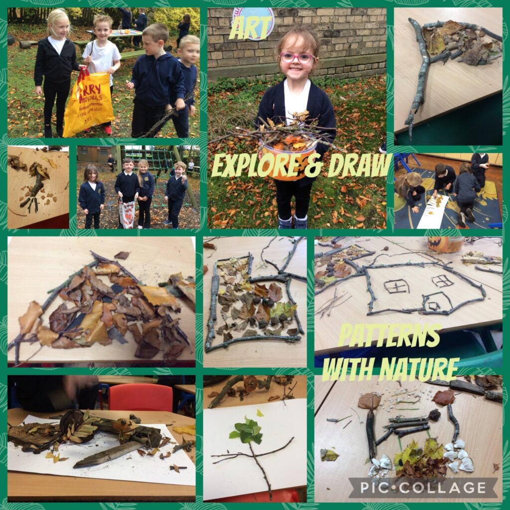 In art the children went outside to explore and collect things that caught their eye around our school environment. They gathered the objects and took them back to class and explored composition and arrangements on paper and table tops. The children played around with the objects to create shapes, patterns using things like twigs, & leaves