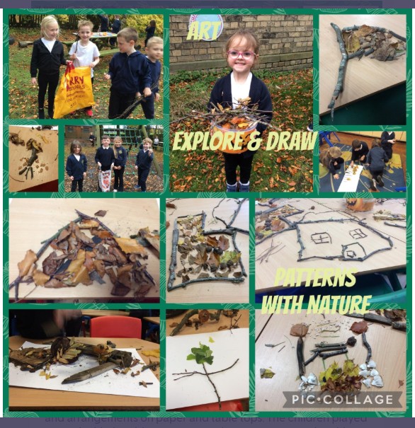 In art we went outside to explore and collect things that caught our eye around our school environment. We gathered the objects and took them back to class and explored composition and arrangements on paper and table tops. The children played around with the objects to create shapes, patterns using things like twigs, & leaves