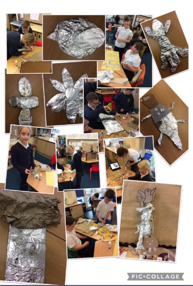 In English, we are reading The Tin Forest. We had a go at making our own tin forest – creating trees, plants, toucans, tigers are more using cardboard and tin foil.